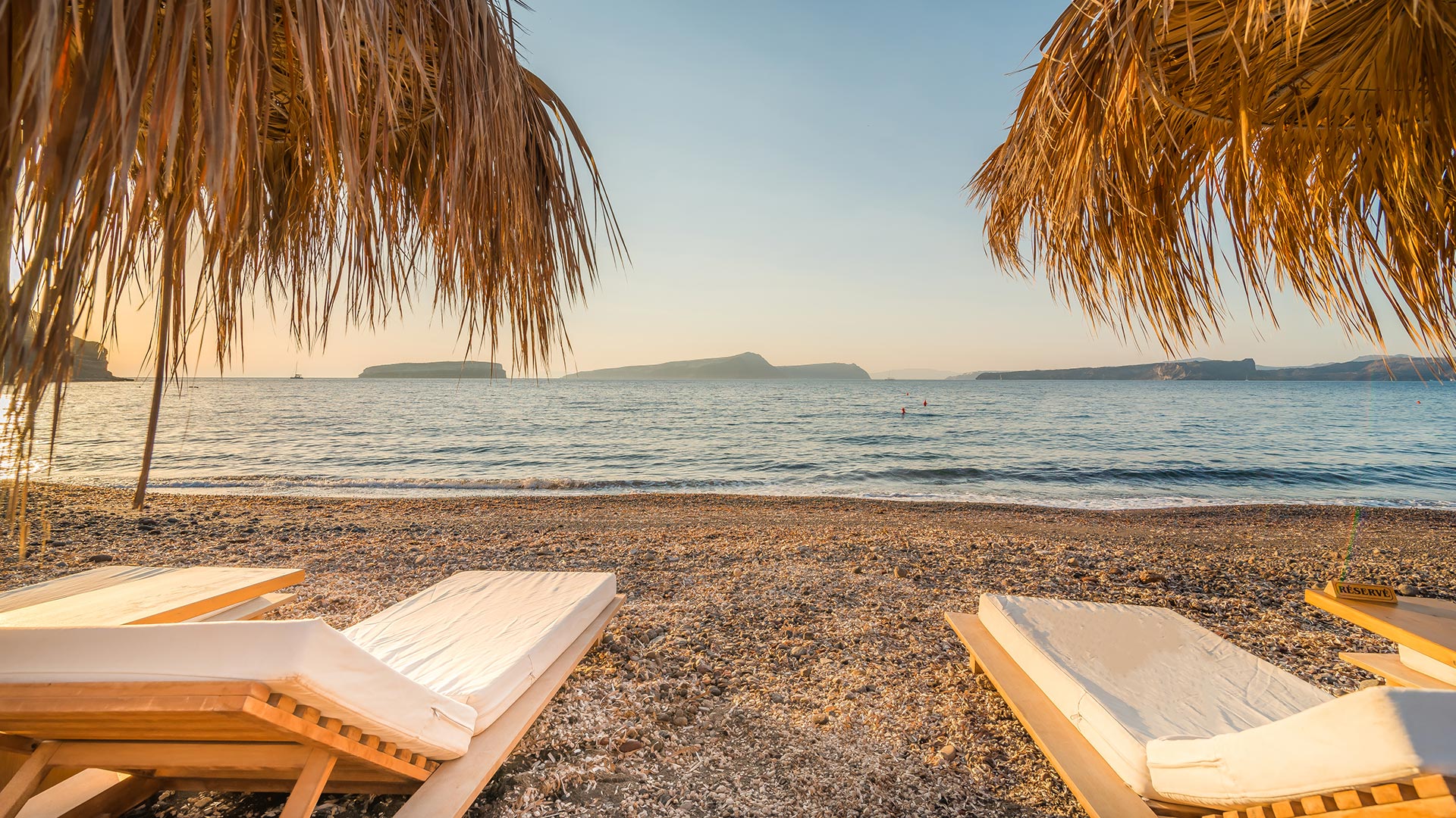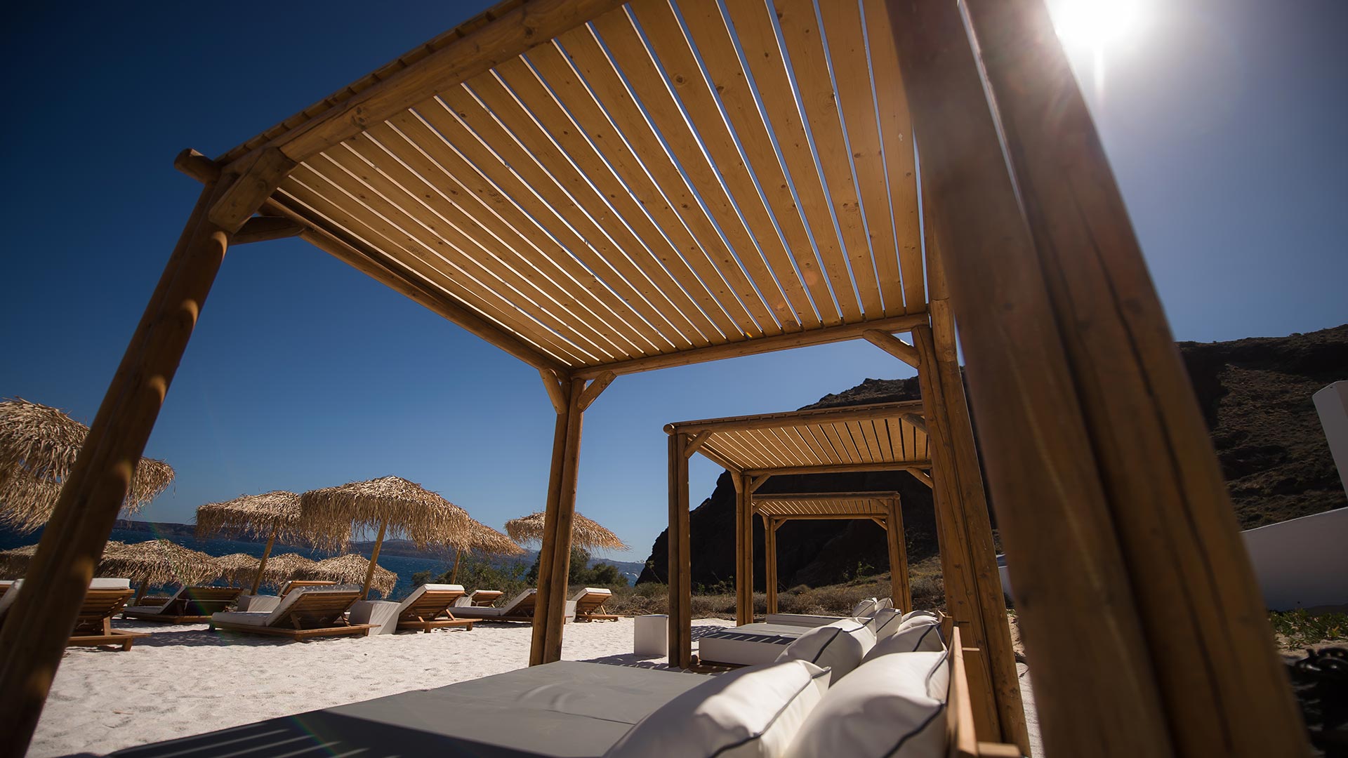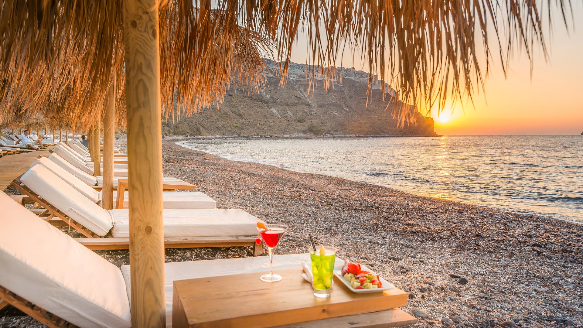 Santorini Sailing's Blue Lagoon Beach. Away from the crowds, Santorini's best kept secret - the only sandy beach in the caldera. Ideally situated to capture the most spectacular view of the caldera, here you can find a tranquil Setting to enjoy light music accompanied by delicious Cocktails and authentic dishes.
