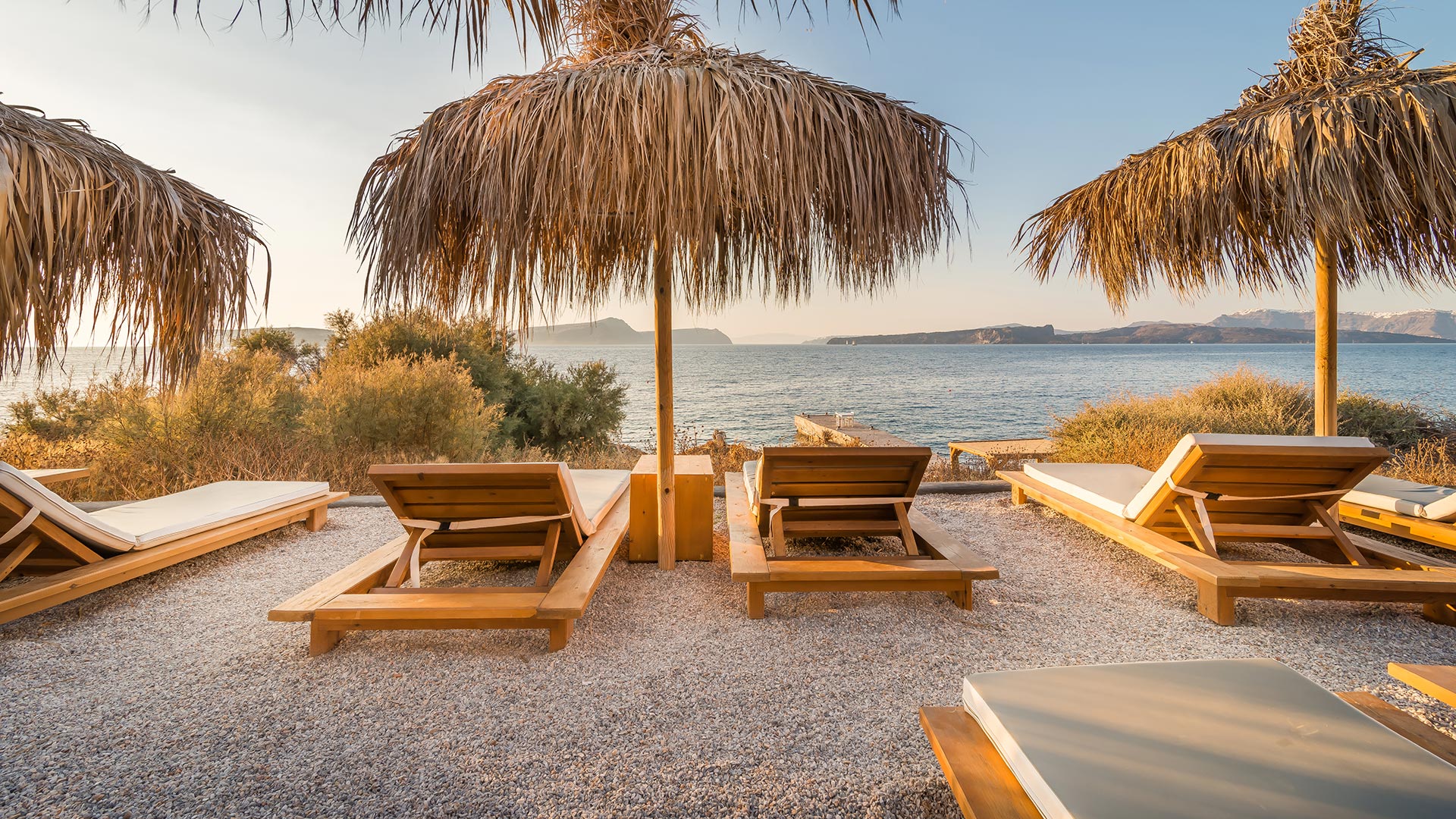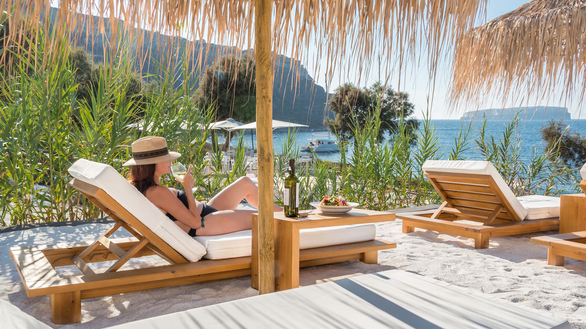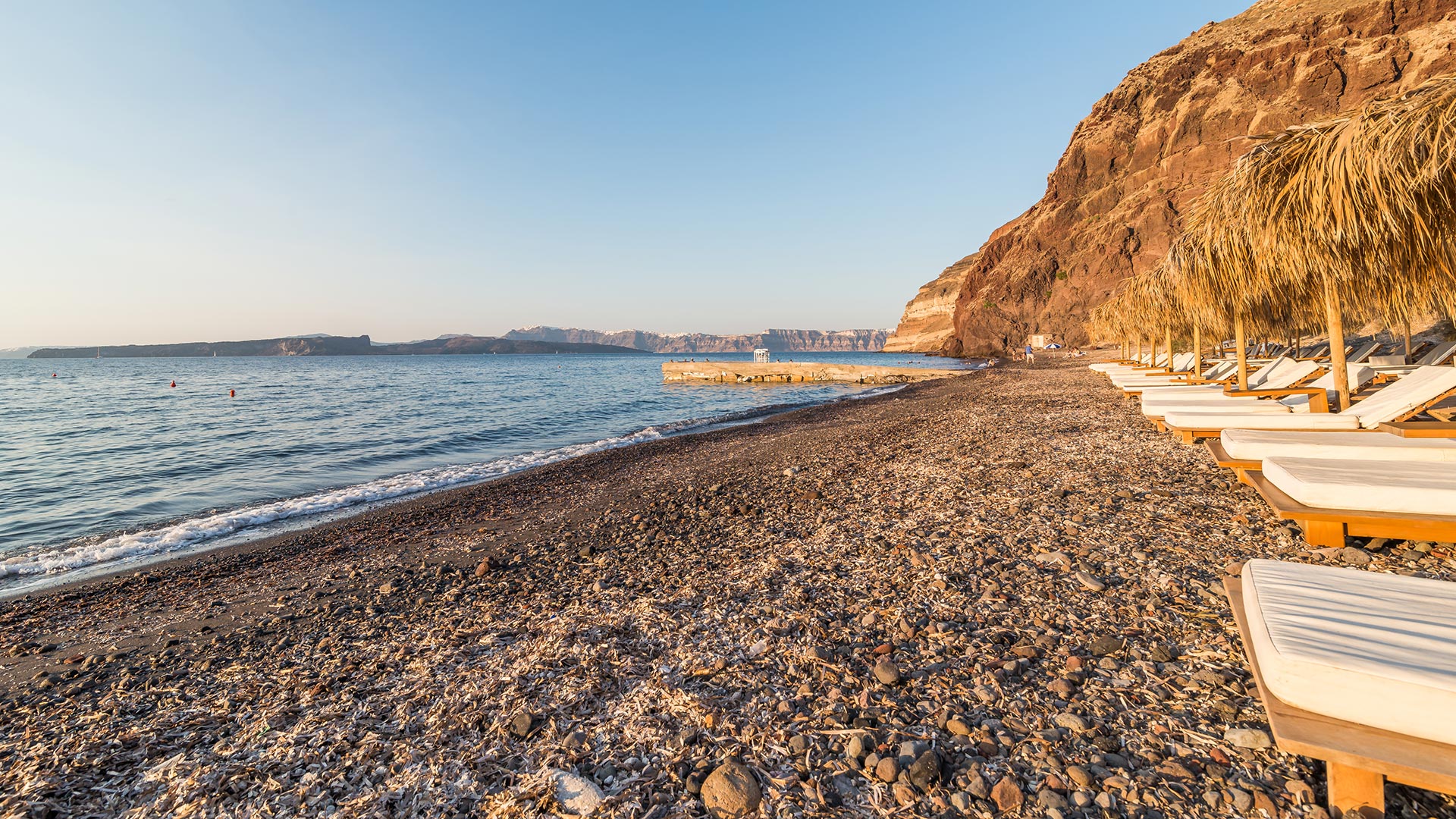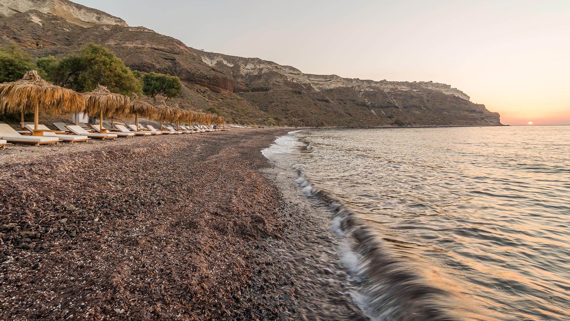 Santorini Sailing's Blue Lagoon Beach. Away from the crowds, Santorini's best kept secret - the only sandy beach in the caldera. Ideally situated to capture the most spectacular view of the caldera, here you can find a tranquil Setting to enjoy light music accompanied by delicious Cocktails and authentic dishes.